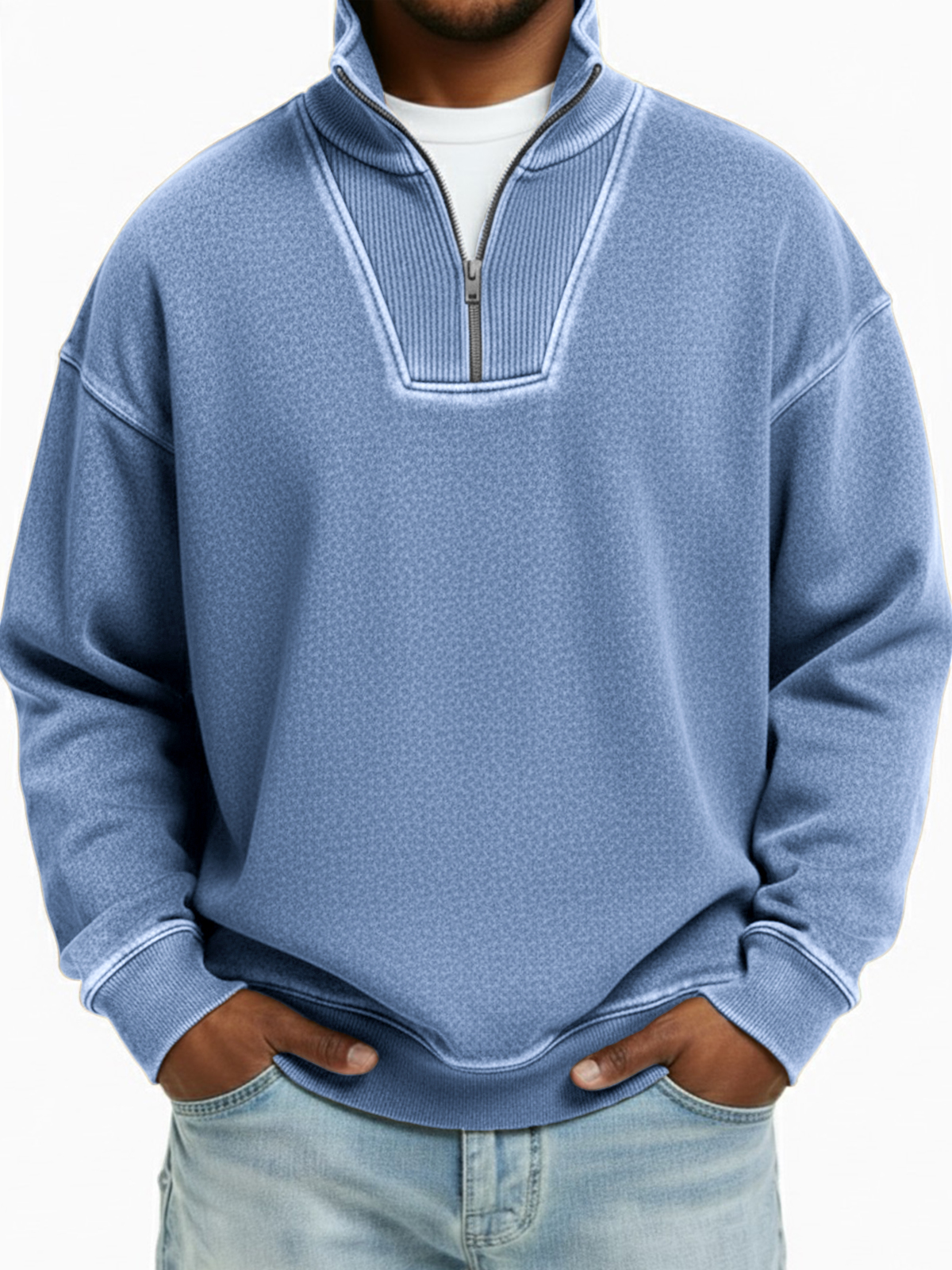 Men's Simple Casual Ribbed Stand Collar Zipper Long Sleeve T-shirt