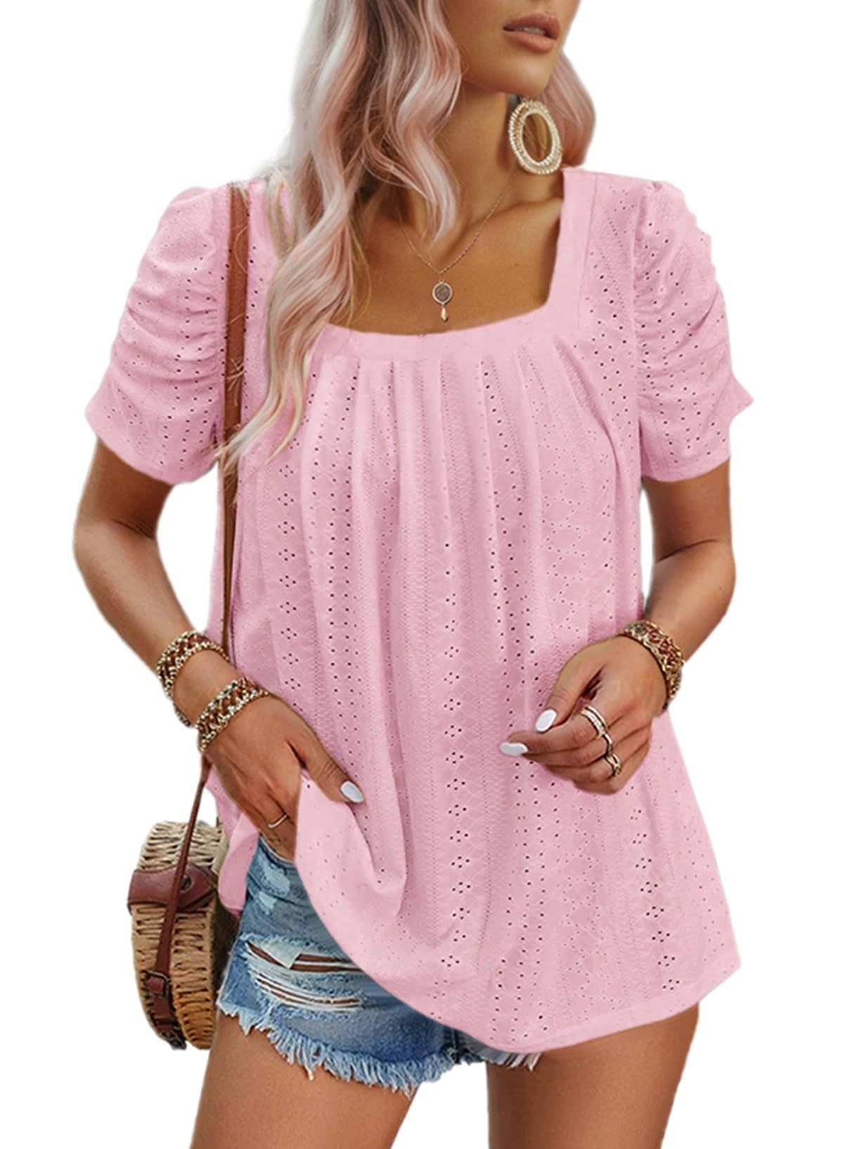 Designed to charm with effortless elegance, this Eyelet Pleated Blouse is a must-have for warm-weather days. Featuring a flattering square neckline, softly gathered short sleeves, and a breezy loose fit, it blends comfort and charm in perfect harmony.