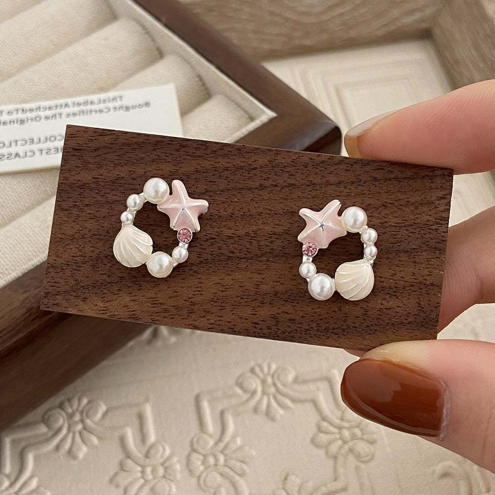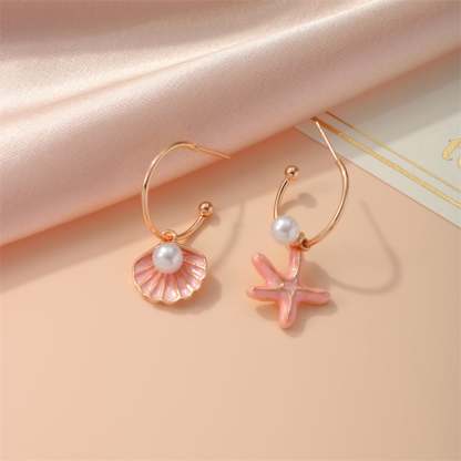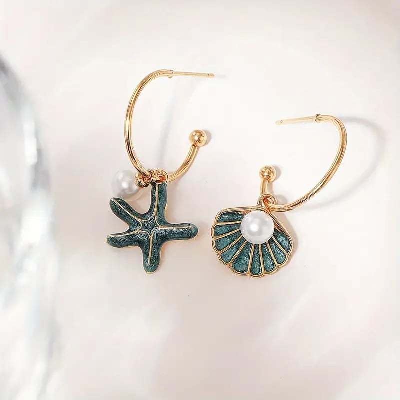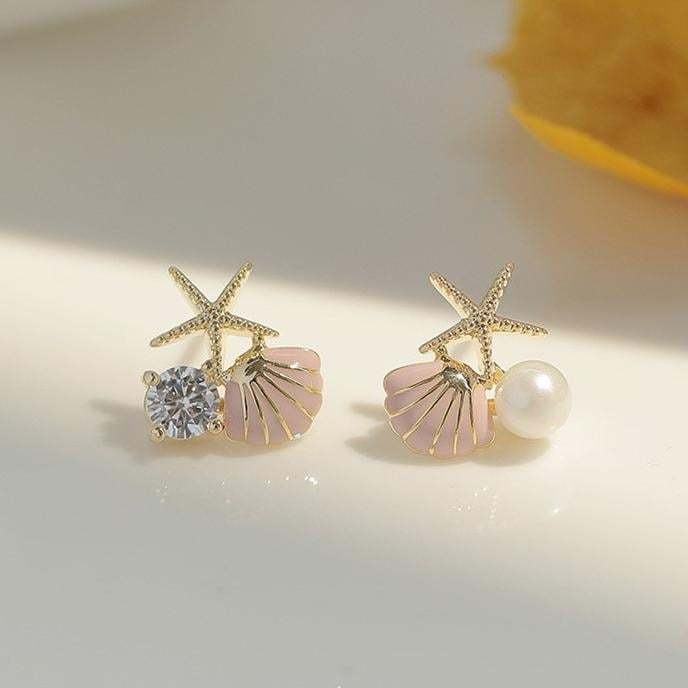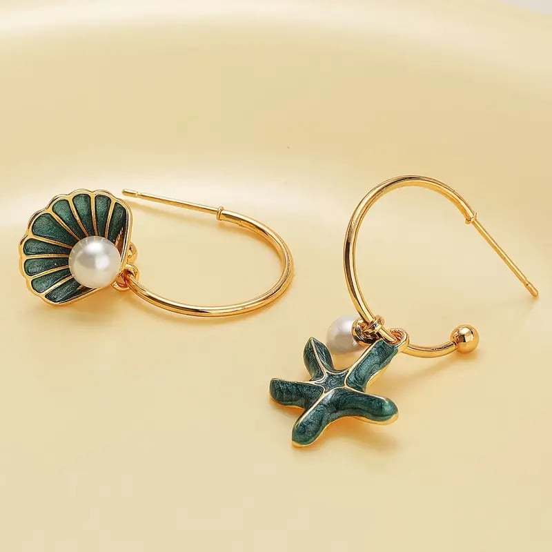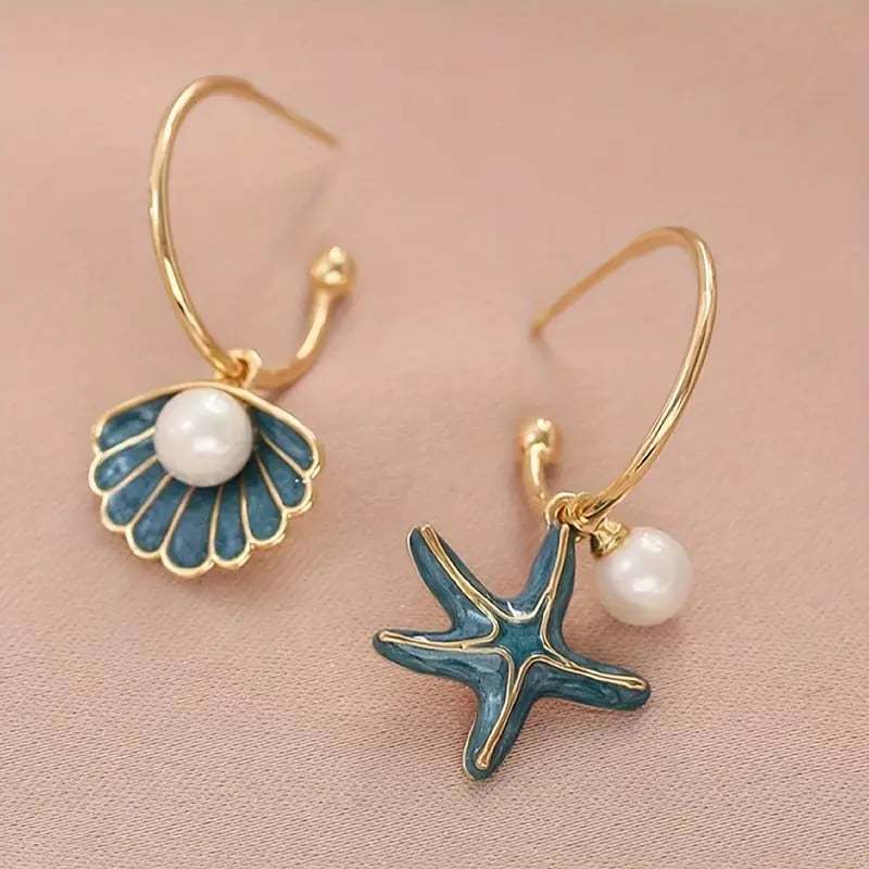 One earring features a golden-rimmed shell. the other a graceful starfish—both accented with a pearl for a unique asymmetrical look.