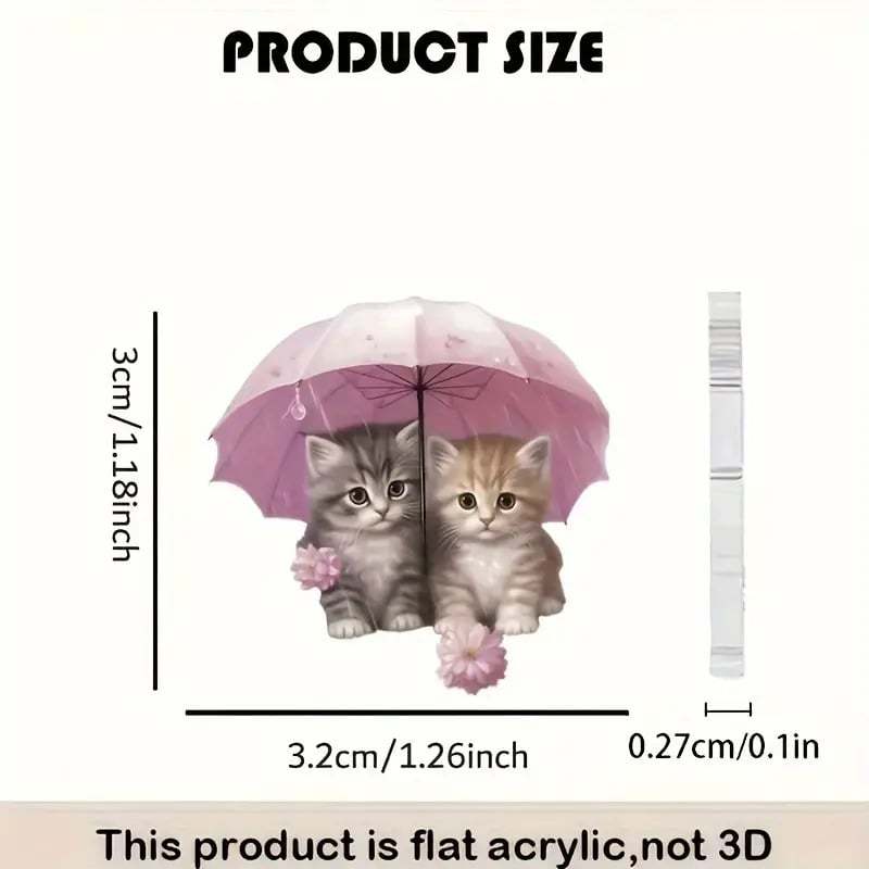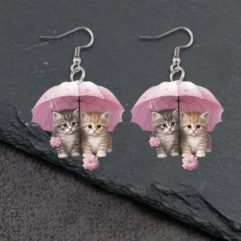 🌸 Charming Pink Umbrella Floral Kittens Art Dangle Earrings