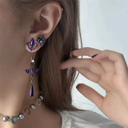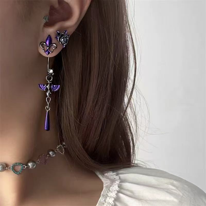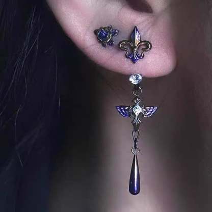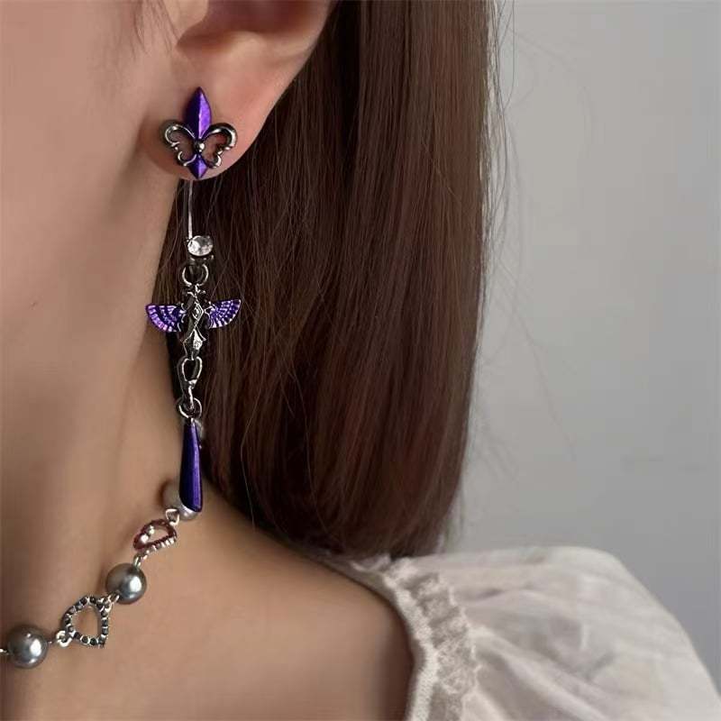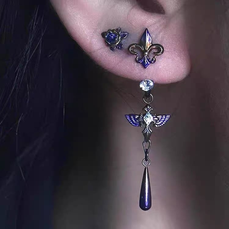 🪽Featuring intricate violet enamel wings. celestial crystal accents. and a sleek teardrop dangle. this piece is made to elevate your style with a touch of darkness and ethereal beauty.