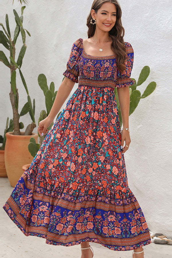 Bohemia Printed Smocked Short Sleeve Maxi Dress