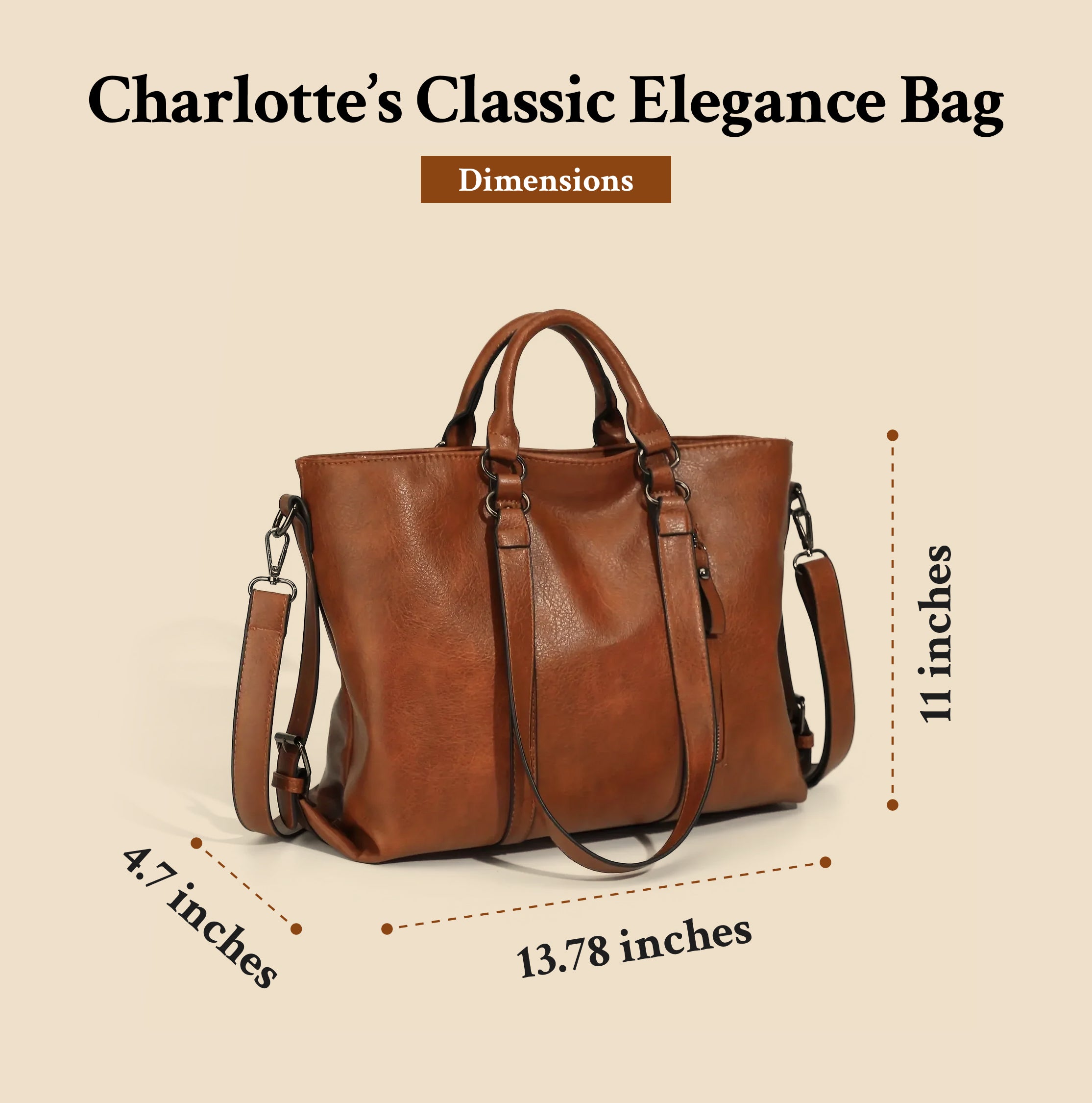 Premium Faux Leather: Charlotte’s Classic Elegance is crafted from high-quality faux leather that combines durability with a luxurious feel. The material is designed for easy maintenance, ensuring that your bag remains as stunning as the day you got it, no matter how often you use it.