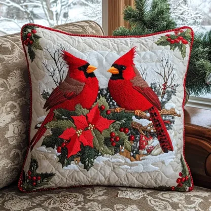Christmas Cardinal & Poinsettia Quilted Pillow