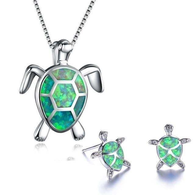Sea Turtle Necklace + Earrings Set in Opal and Silver