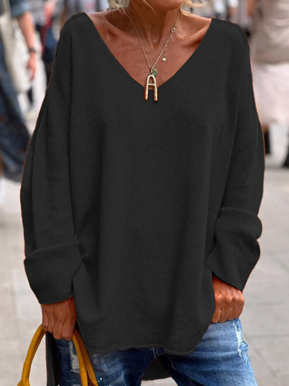 🎄 New Arrivals🔥 Women's Solid Color V-neck Long-sleeved Casual Loose-fitting Knitted Pullover Sweater