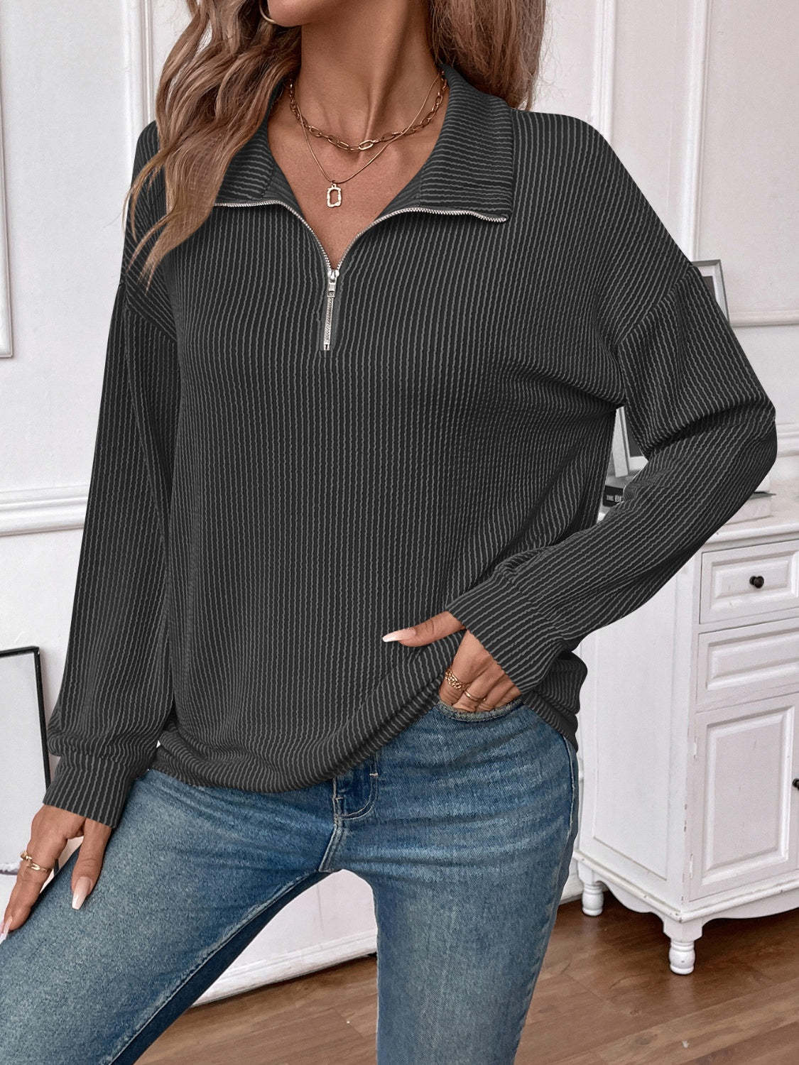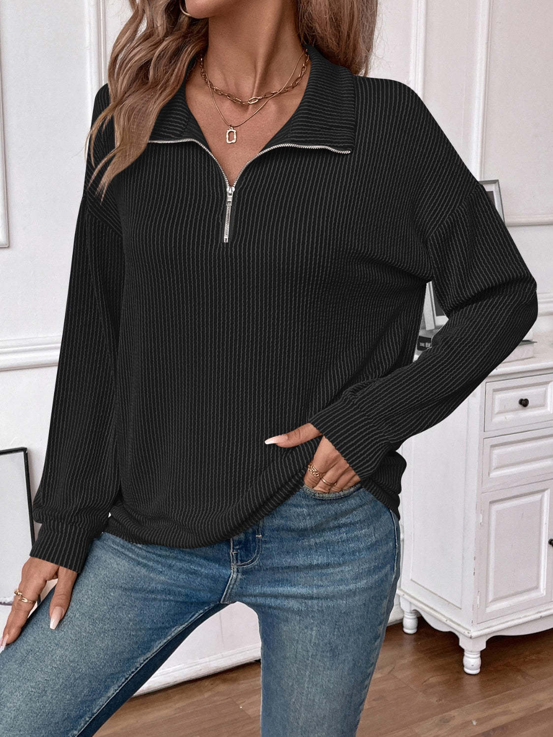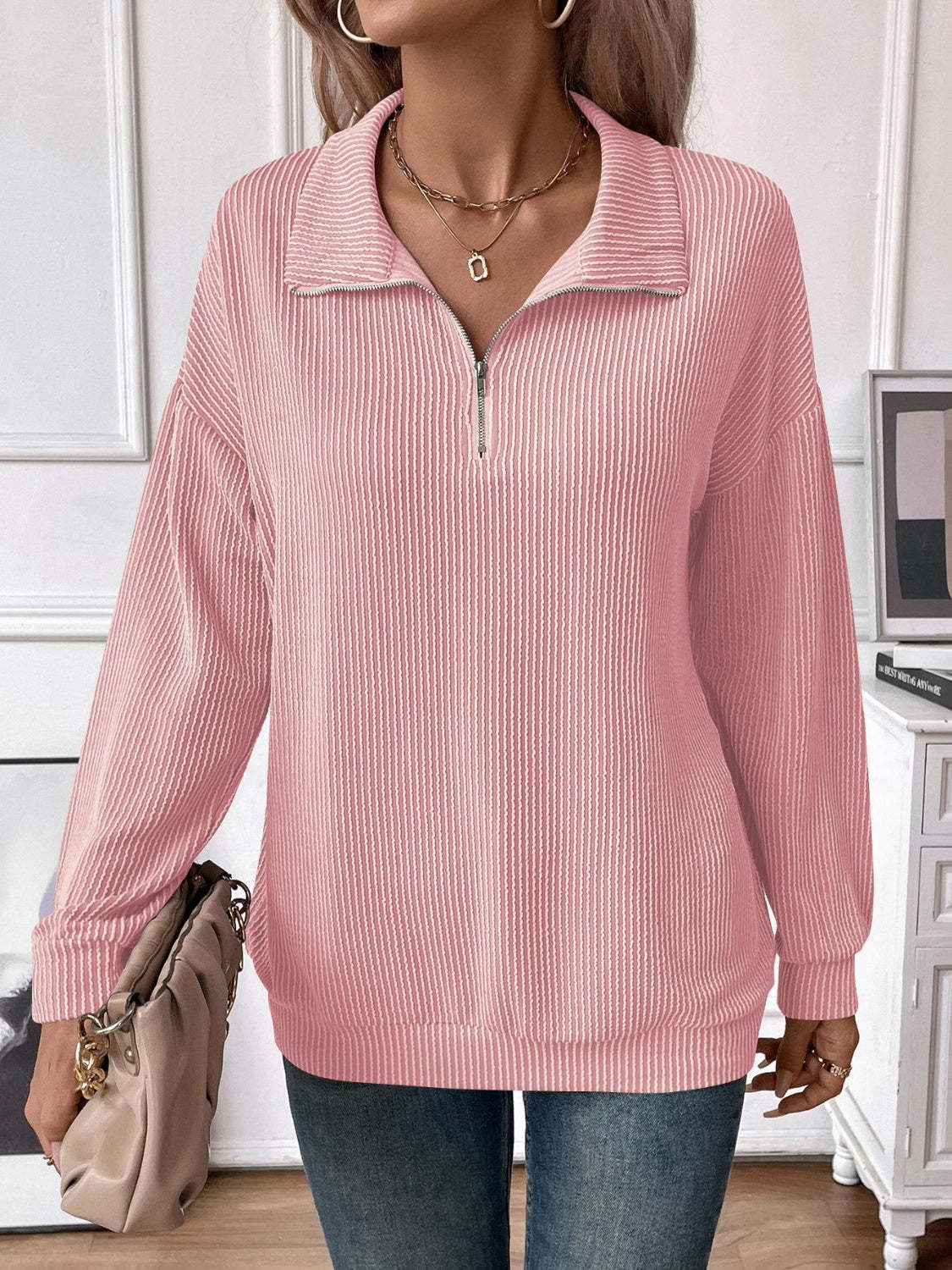 Double Take Striped Half Zip Long Sleeve T-Shirt