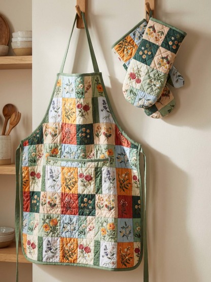 Flower Quilted Apron Set (2-Piece) – Padded Apron + Heat-Resistant Oven Mitts
