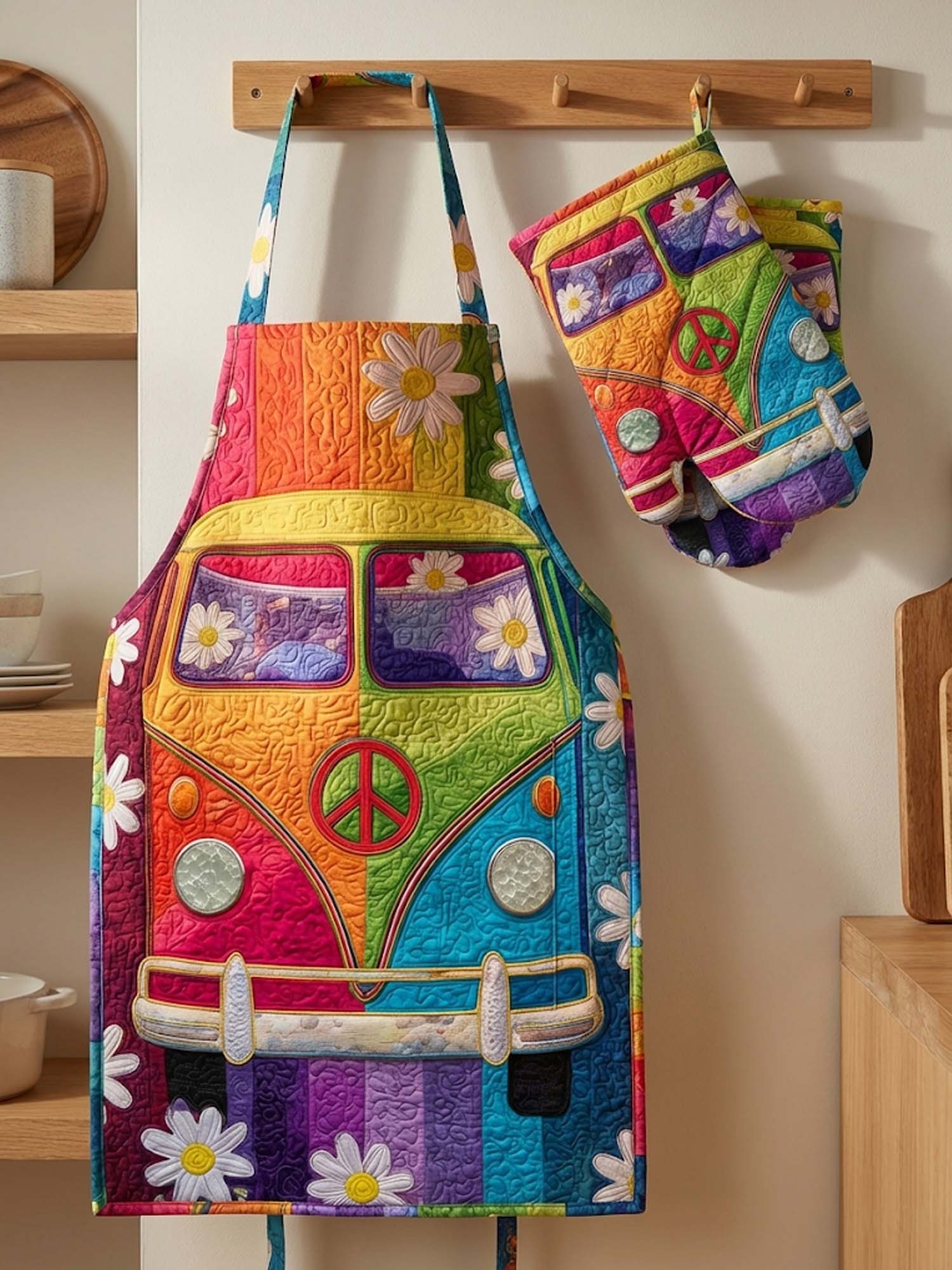 Hippie Van Quilted Apron Set (2-Piece) – Padded Apron + Heat-Resistant Oven Mitts