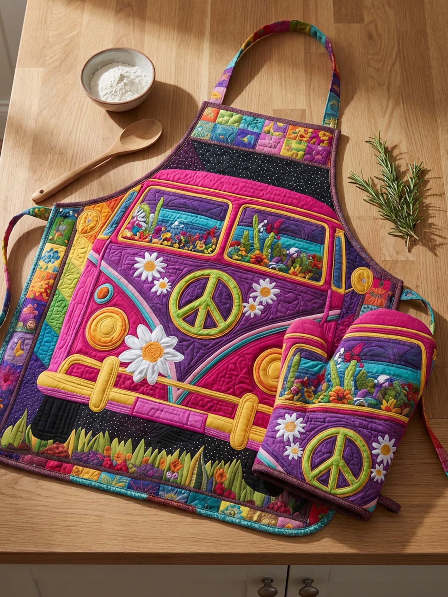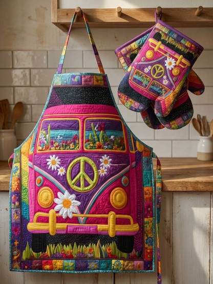 Hippie Van Quilted Apron Set (2-Piece) – Padded Apron + Heat-Resistant Oven Mitts