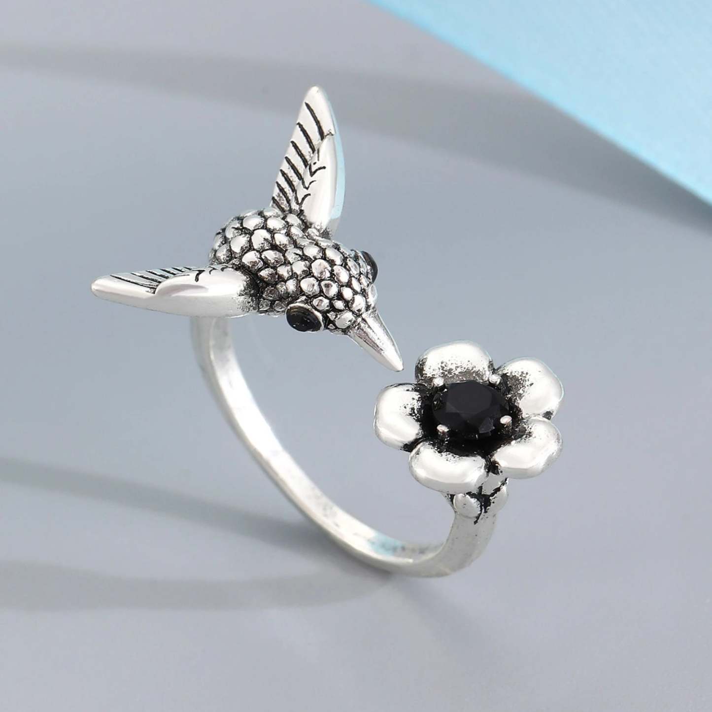 Hummingbird & Flower Ring – Adjustable Open Bird Ring for Women