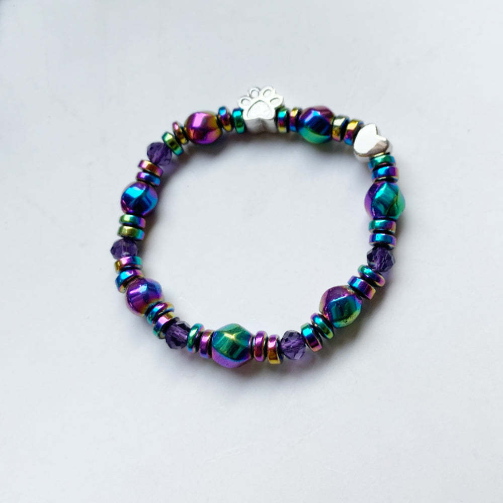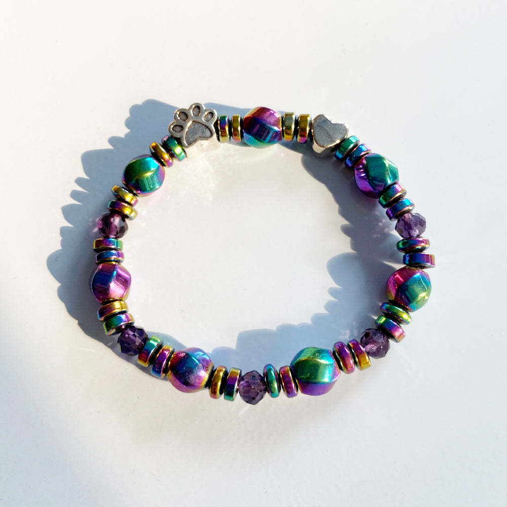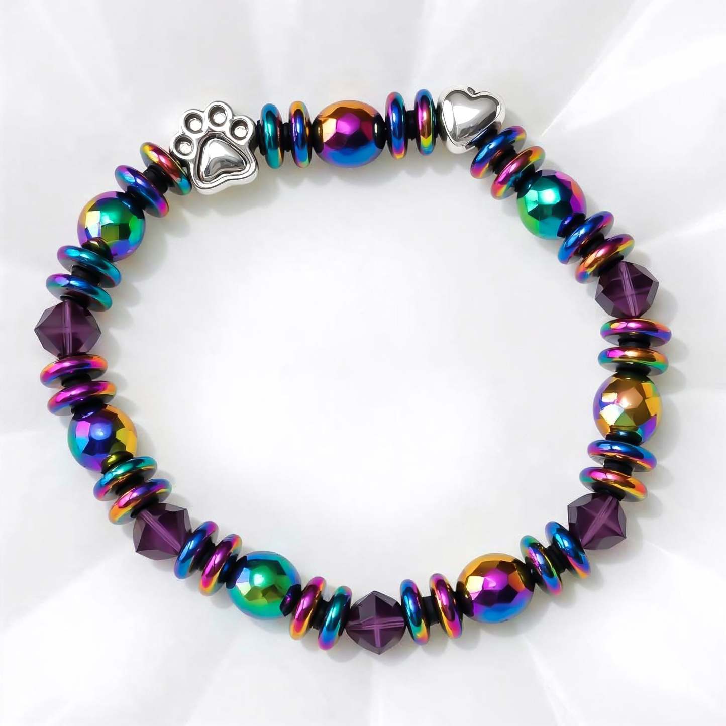 Embrace the magical connection you share with your furry companion through our Enchanted Paw Print Charm Bracelet. Each delicate paw print and heart charm tells a story of unconditional love, loyalty, and the precious moments shared with our beloved pets. The shimmering black healing stone captures light beautifully, creating an elegant reminder of the joy and comfort our four-legged friends bring to our lives.