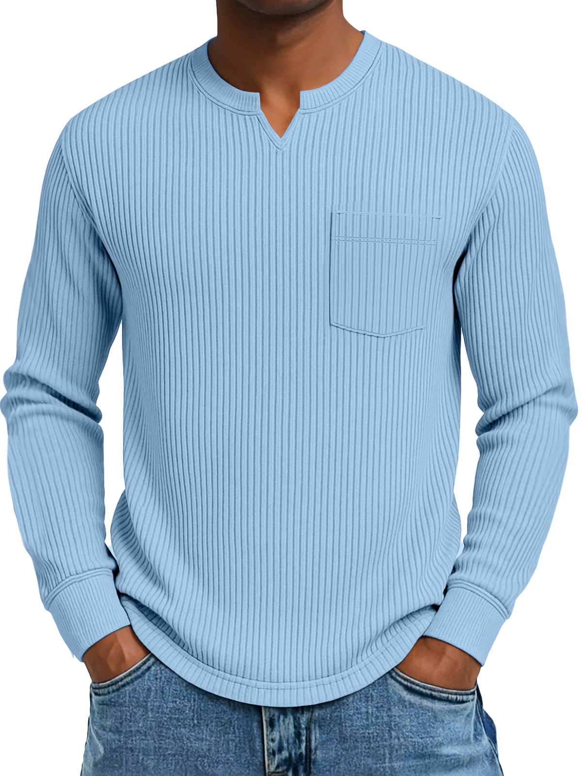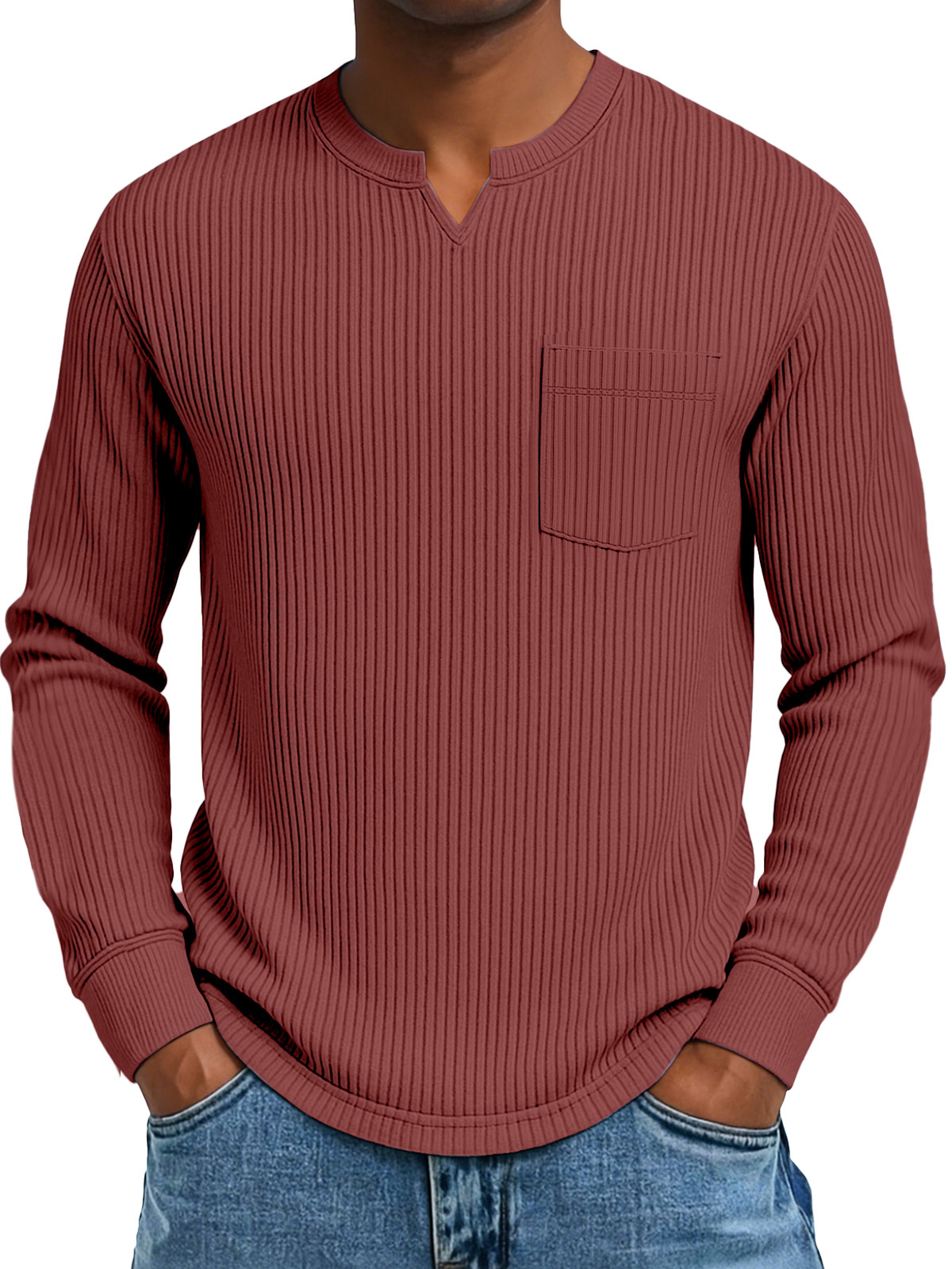 Men's Casual Pure Color Pocket Vertical Pit Small V-Neck Long Sleeve T-Shirt