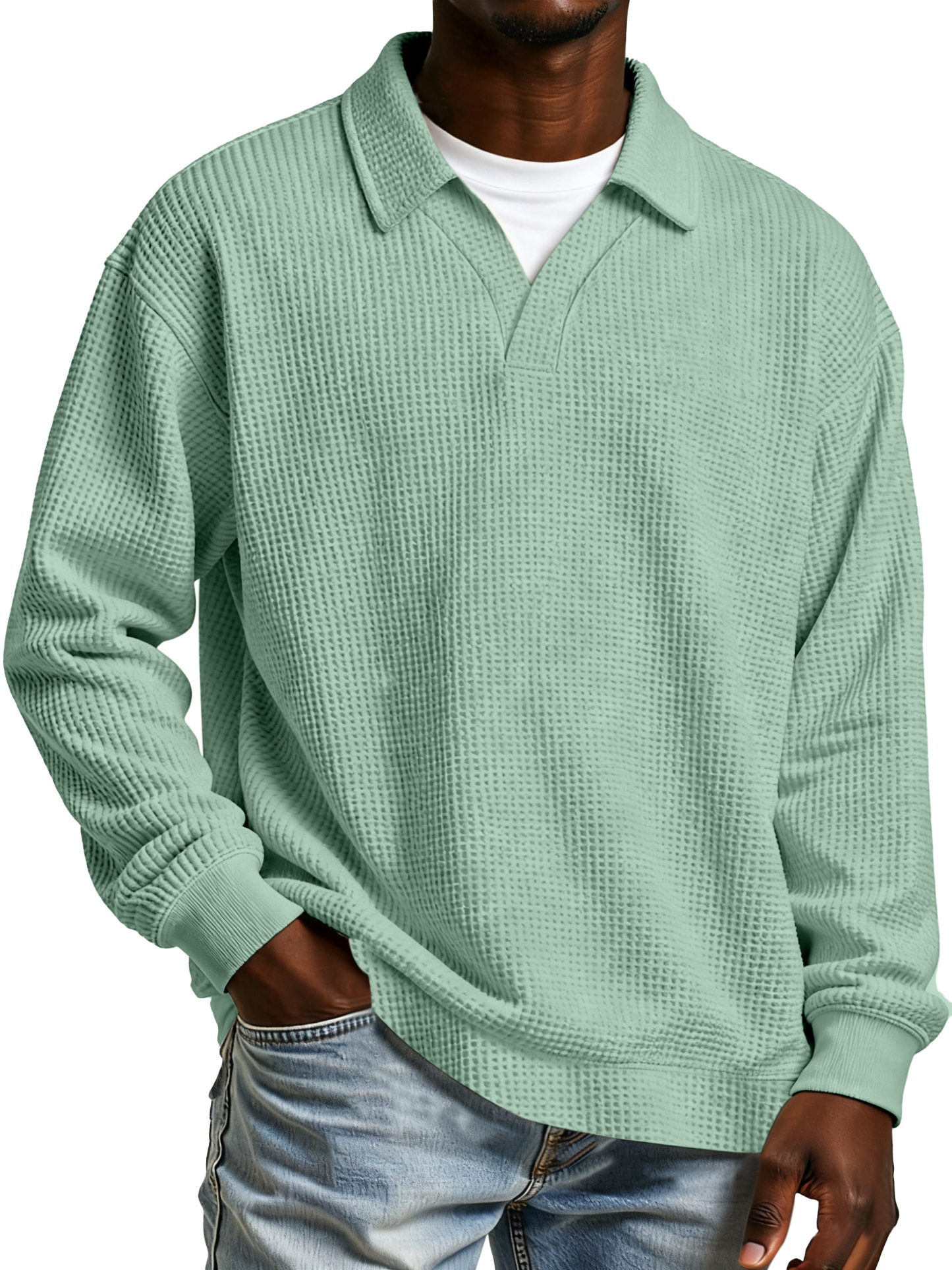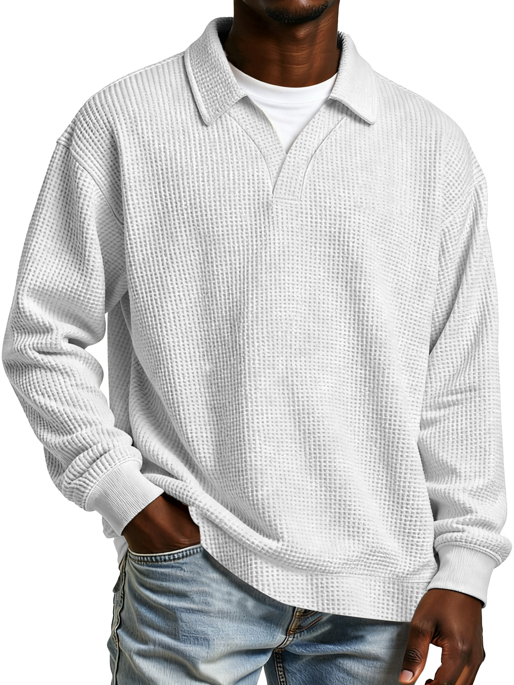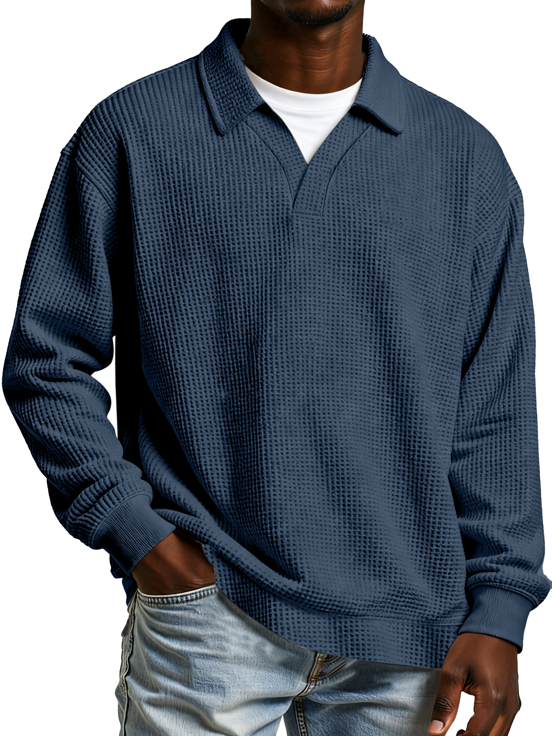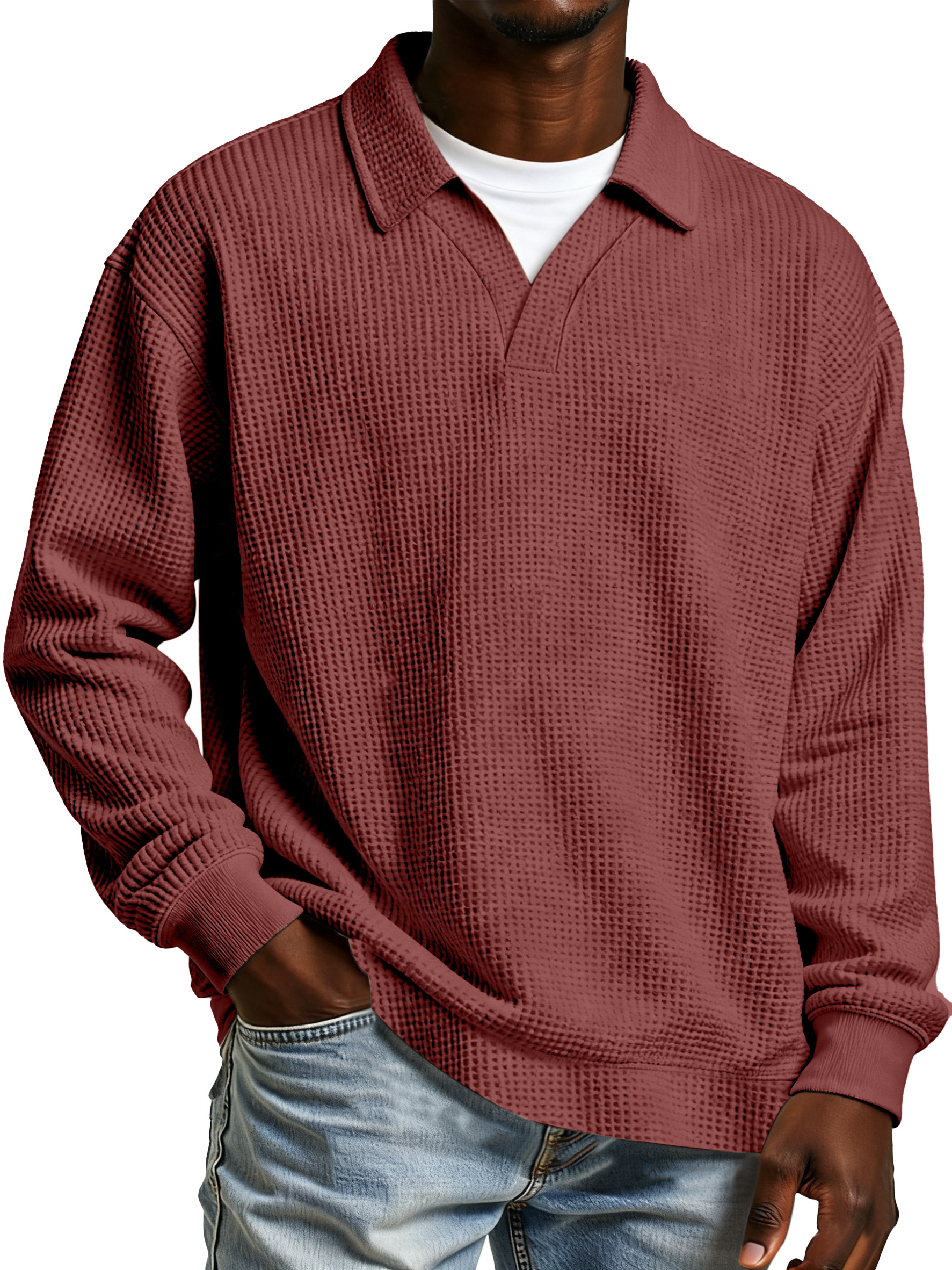 Men's Daily Loose And Simple Waffle Half-zip Stand Collar Long-sleeved Polo Shirt