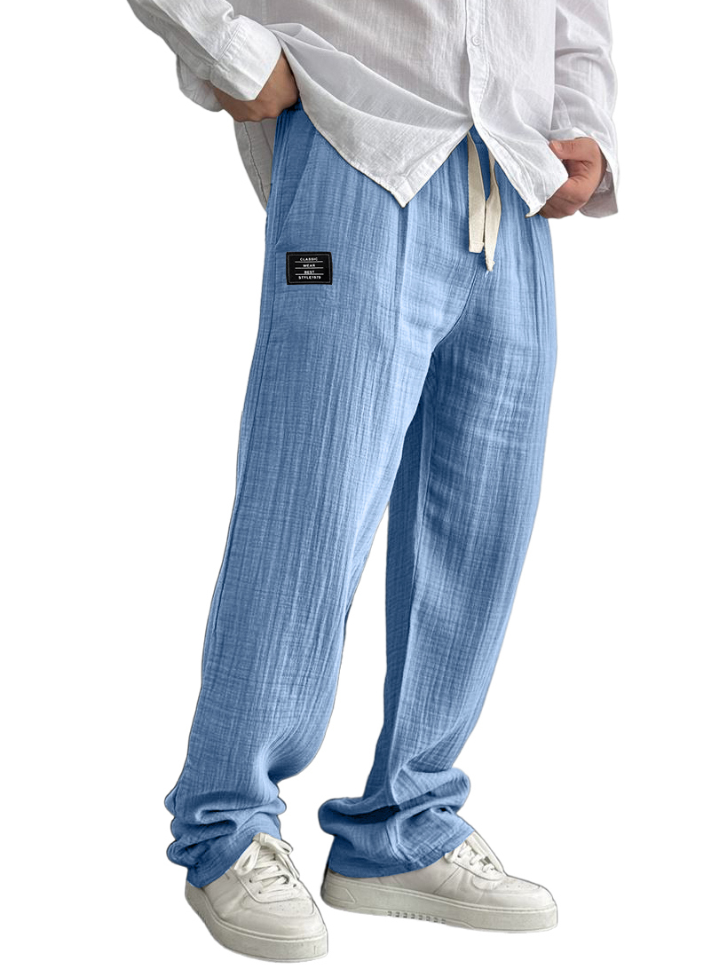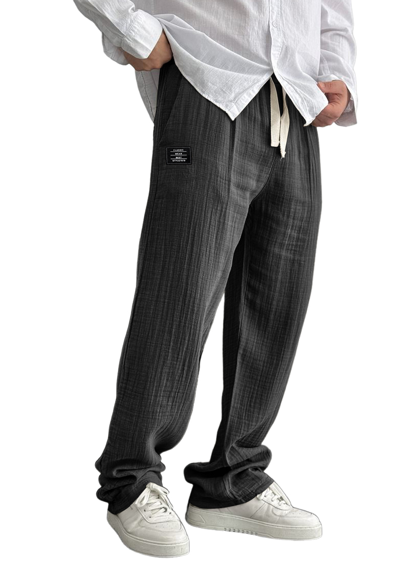 Men's Cotton And Linen Casual Embroidered Logo Drawstring Loose Elastic Waist Pocket Trousers