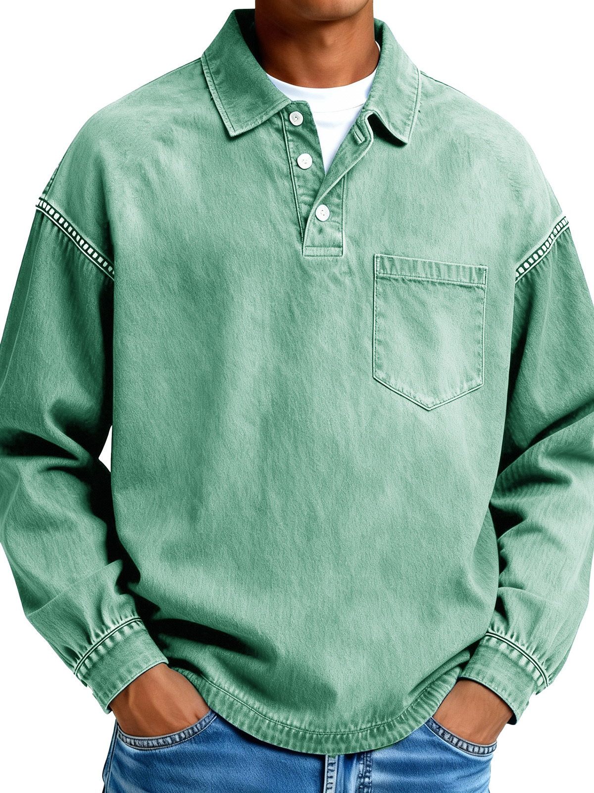 Men's Fashionable Retro Distressed Pocket Collar Long-Sleeve Polo Shirt