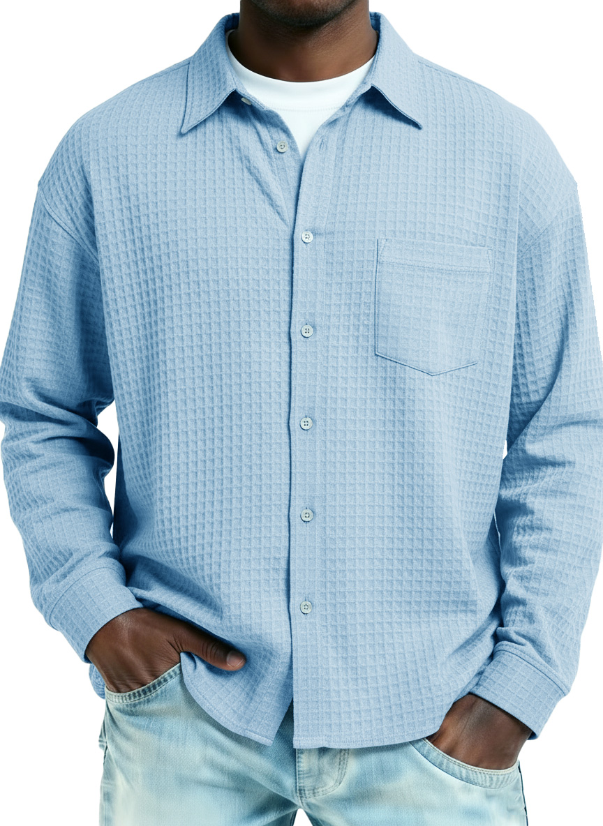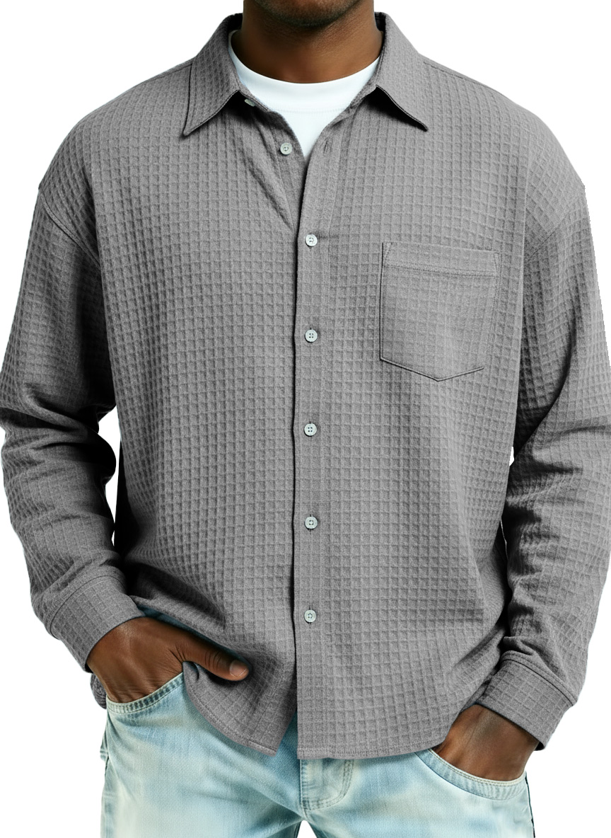 Men's Fashionable Retro Large Waffle Fabric Pocket Long-Sleeved Collared Shirt