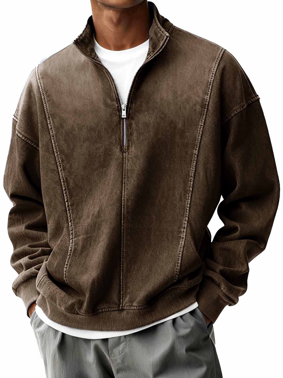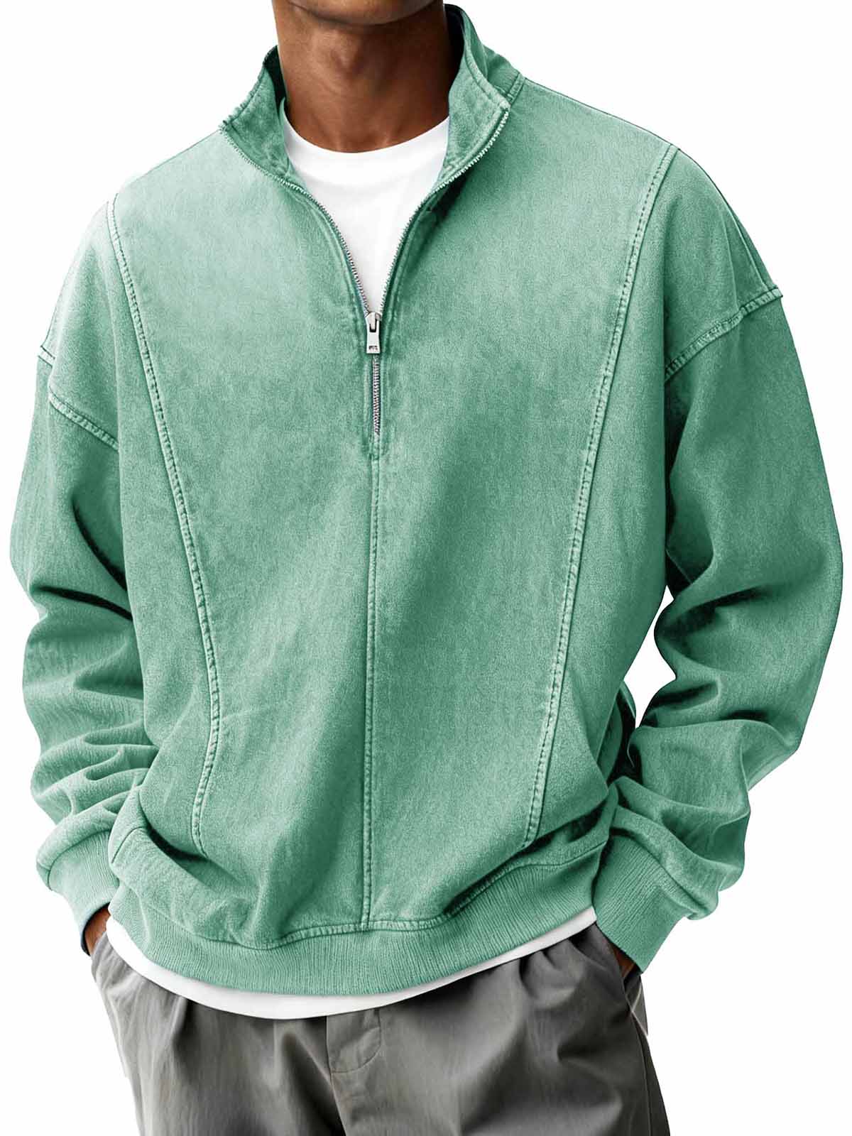 Men's Retro Stand Collar Zipper Casual Loose Solid Color Long Sleeve T-shirt
