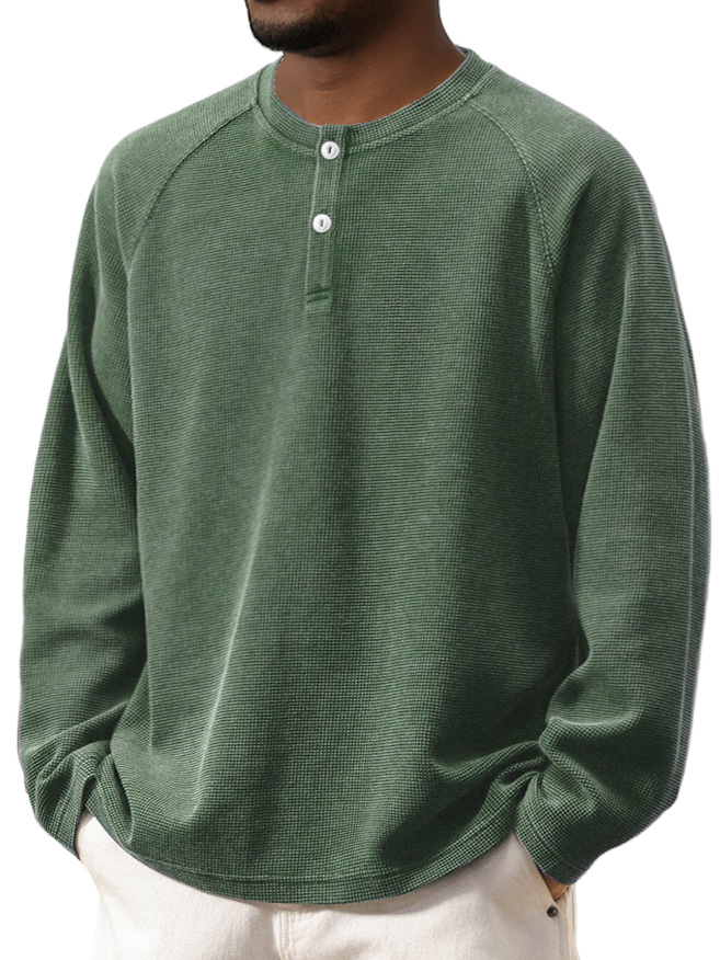 Men's Retro Fashion Washed Waffle Gown with Raglan Sleeves and Henley Style Long Sleeves