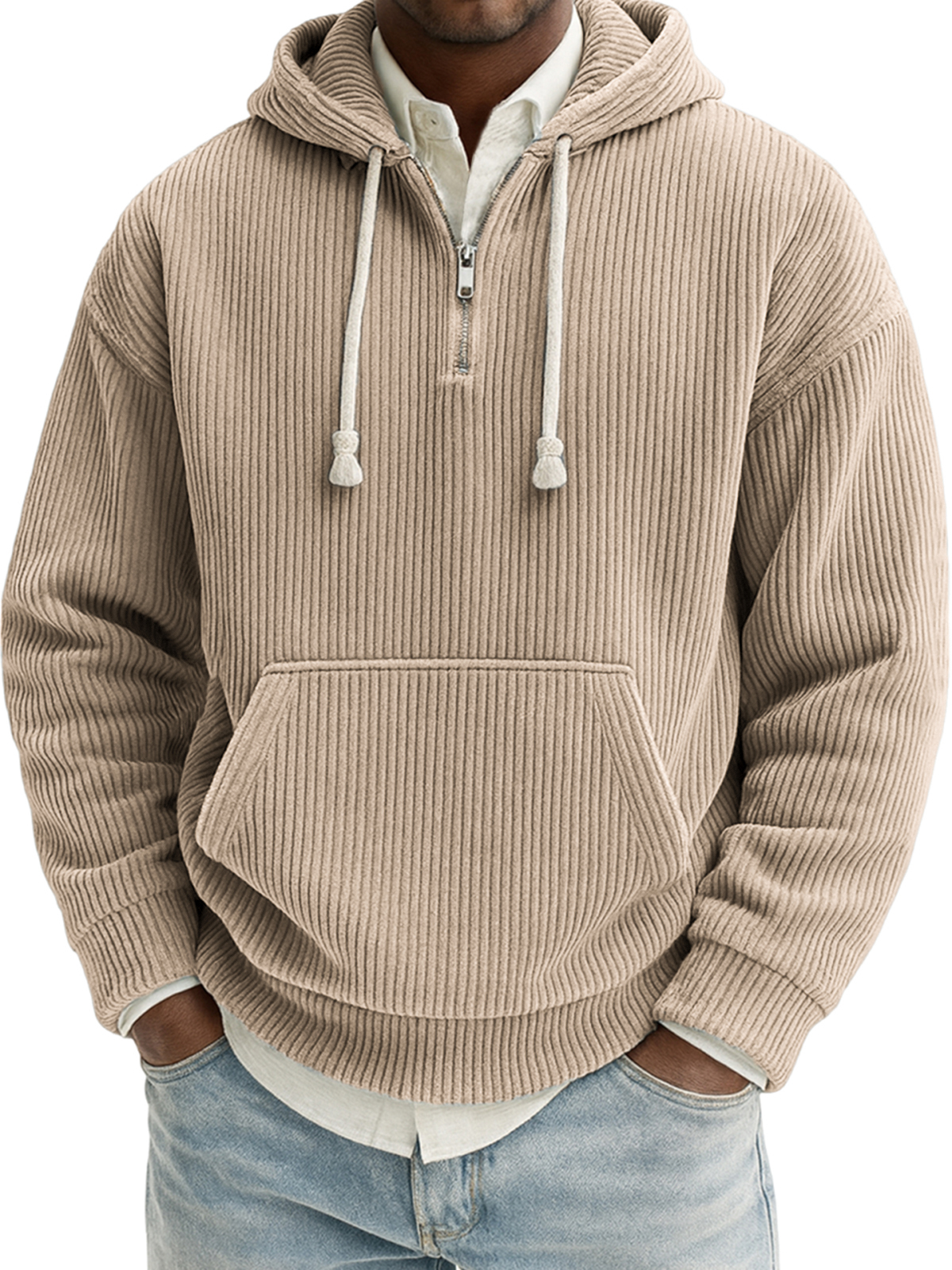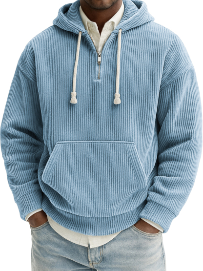 Men's Stylish Quarter-zip Corduroy Ribbed Casual Pullover Hooded Sweatshirt