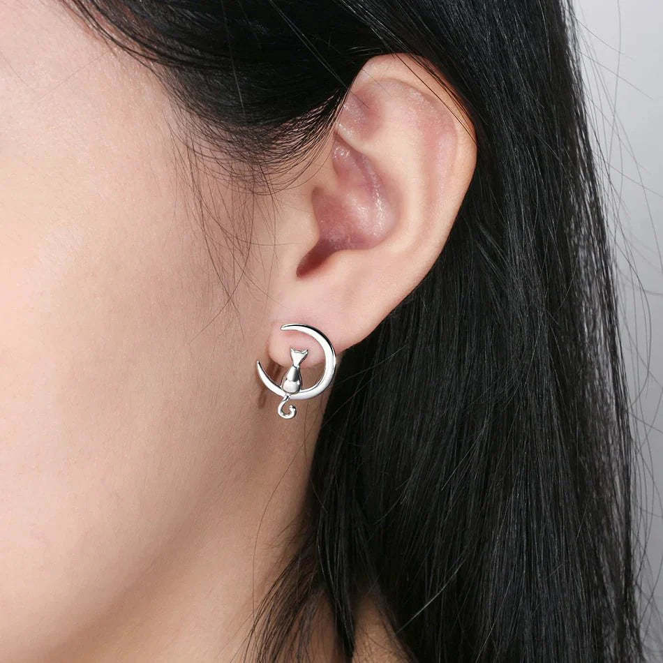 Moon & Cat Sterling Silver Stud Cat Earrings