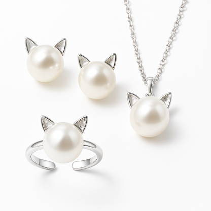 The set includes a luminous pearl cat necklace, matching stud earrings, and an adjustable ring—each featuring the signature cat ear silhouette paired with a soft, glowing pearl. The result is a look that’s modern, feminine, and delightfully expressive without ever feeling overwhelming.