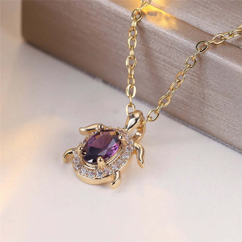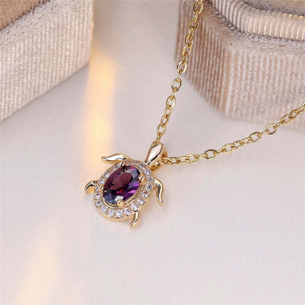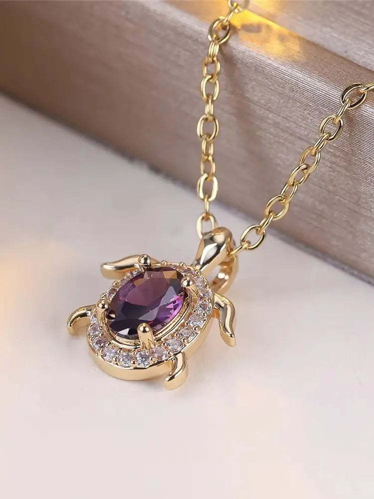 The turtle has long been a symbol of longevity, protection, and steady progress. This little companion reminds us that life's most meaningful moments come not from rushing, but from moving forward with purpose and heart. The deep purple crystals capture the mystery of twilight skies, while golden warmth radiates from its vintage-inspired setting.