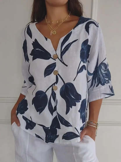 Women's V-Neck Cotton-Linen Button-Up Top