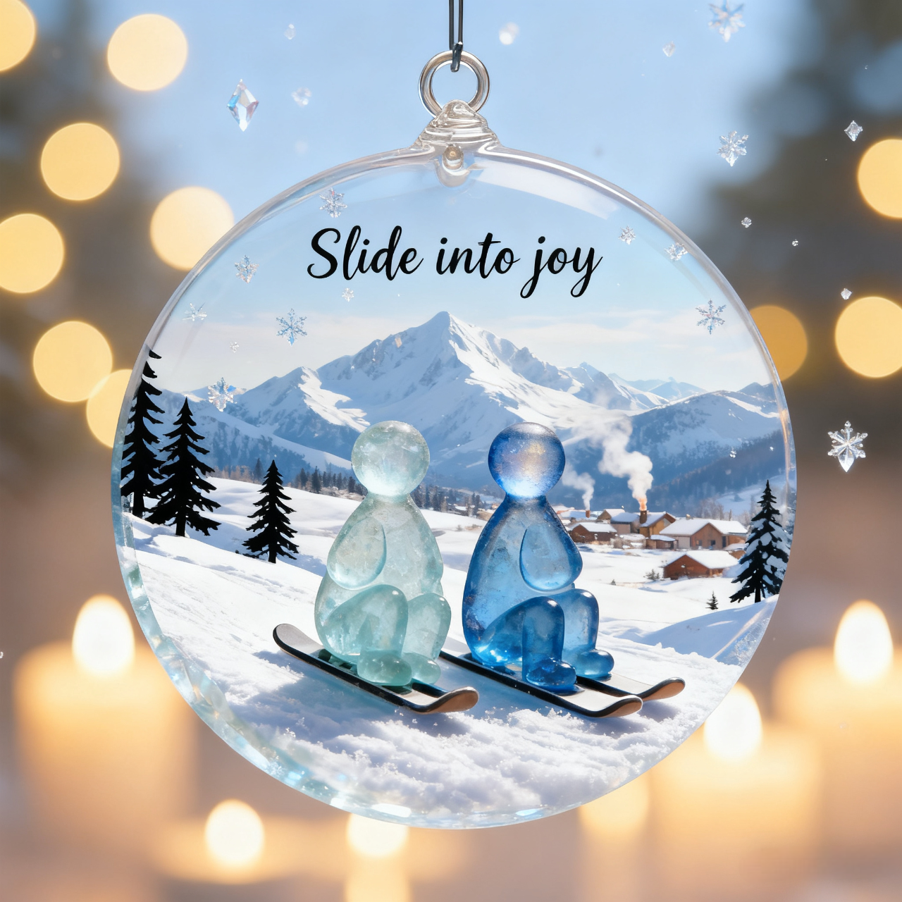 - “Glide through life’s adventures.” Ornament: Features two frosty, abstract figures against a backdrop of snow-capped peaks, ski lifts, and skiers in action. The message inspires embracing life’s exciting journeys.