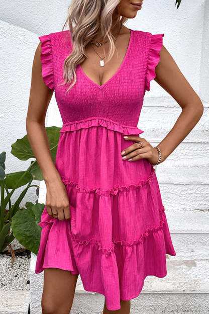 - Solid Smocked V Neck Frill Casual Dress