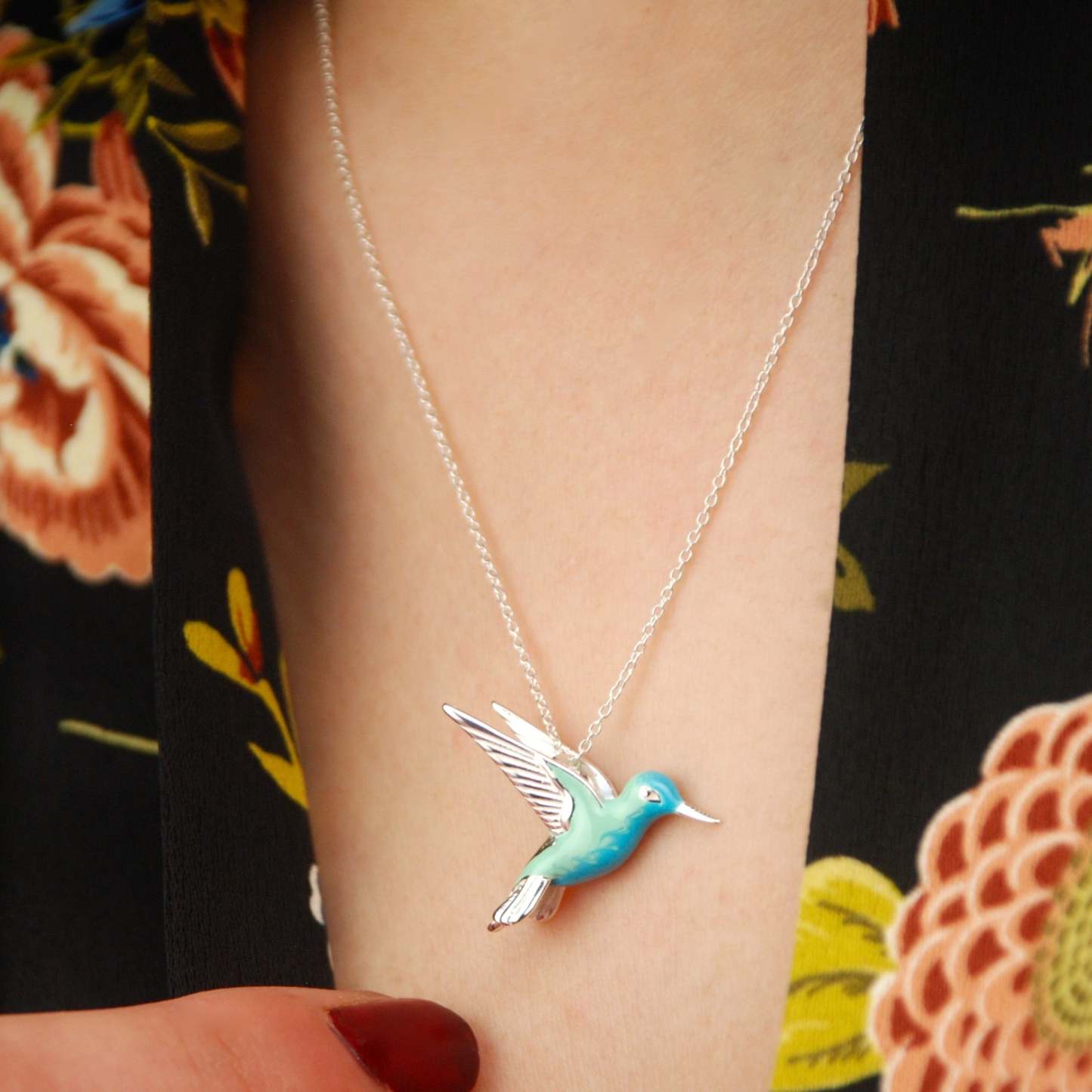 A gorgeous sterling silver hummingbird pendant with beautiful turquoise and blue enamel detailing.