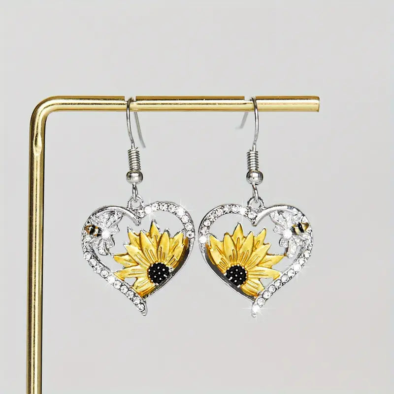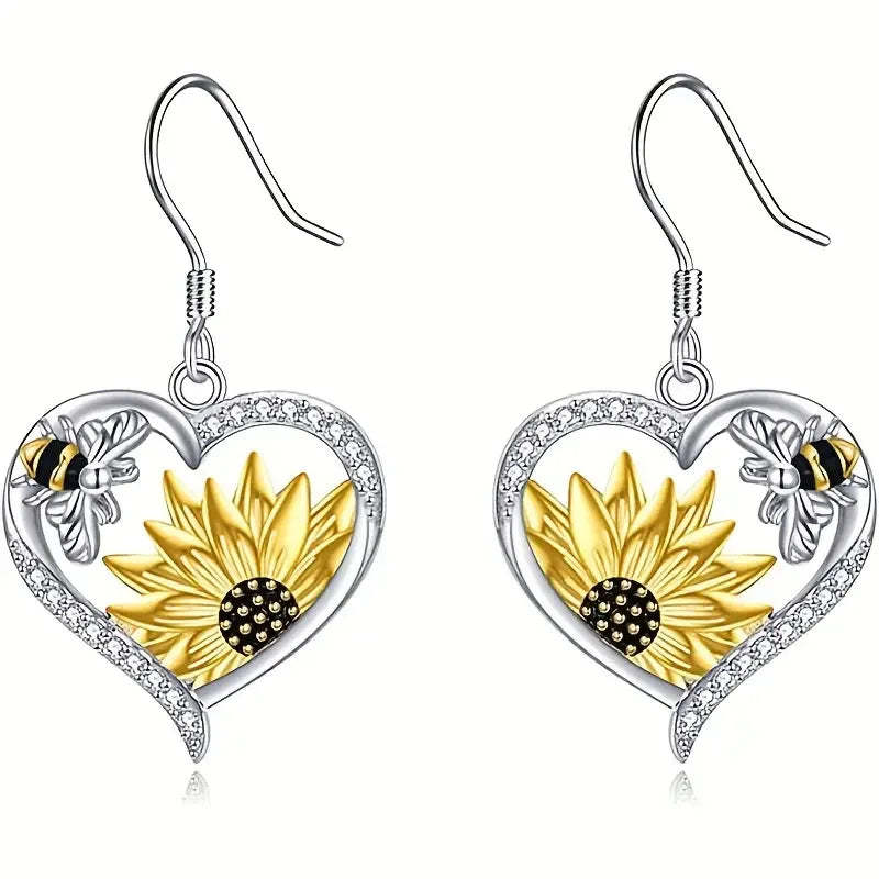 - Unique Design: Heart-shaped earrings with sunflower & bee motif.
