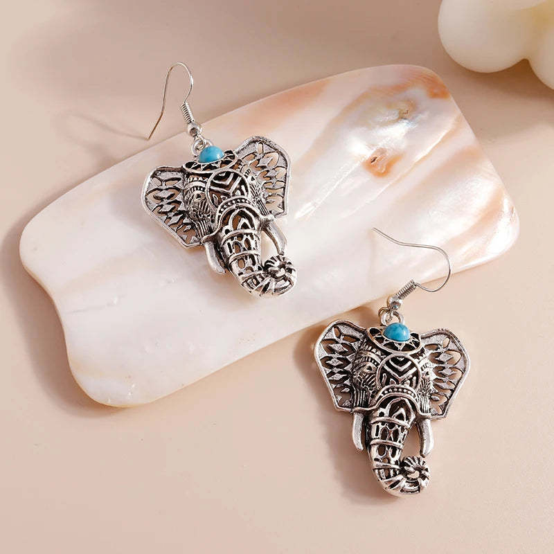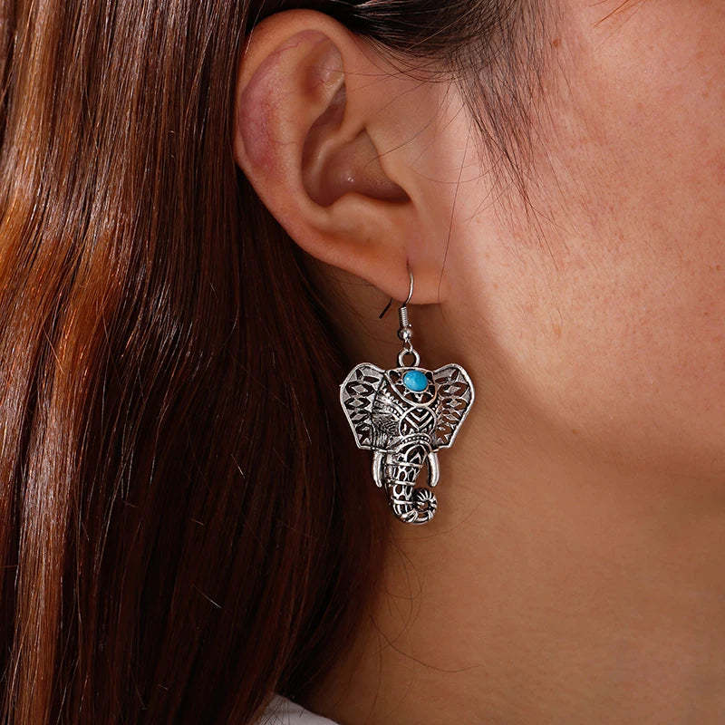 Vintage Elephant Drop Earrings Silver Bohemian