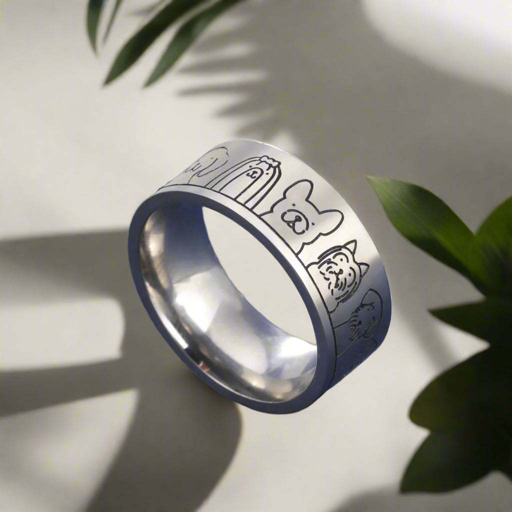 This stylish Stainless Steel Dog Ring with Engraved Motifs is the perfect statement piece for anyone who wants to wear their love for pets proudly. The detailed engraving features various dog breeds — from puppies to adult dogs — making it a bold accessory for both men and women.