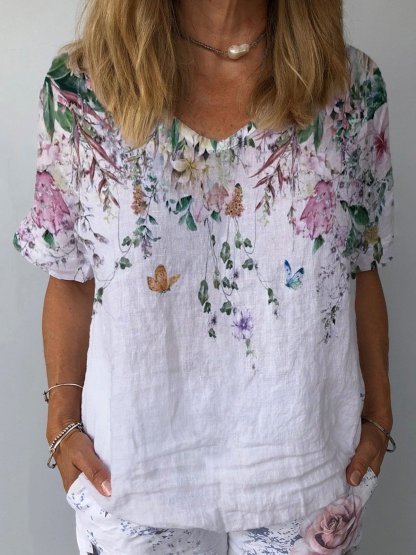Women's Hanging Floral Print Cotton Linen T-Shirt