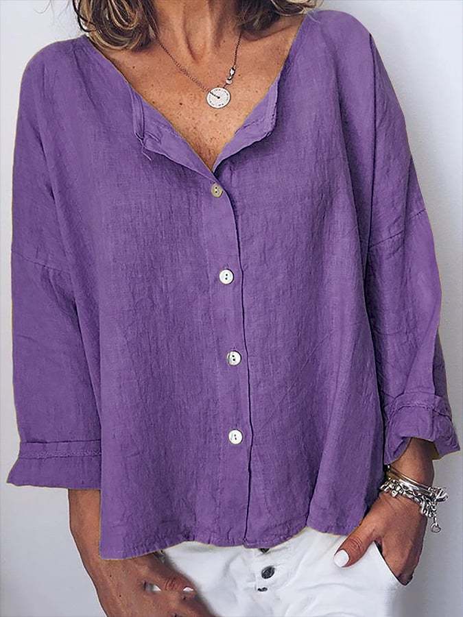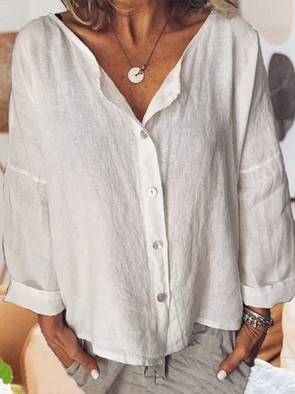 Women's V-Neck Cotton-Linen Button-Up Top