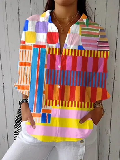 Women's Vintage Abstract Floral Art Print Linen V-Neck Shirt